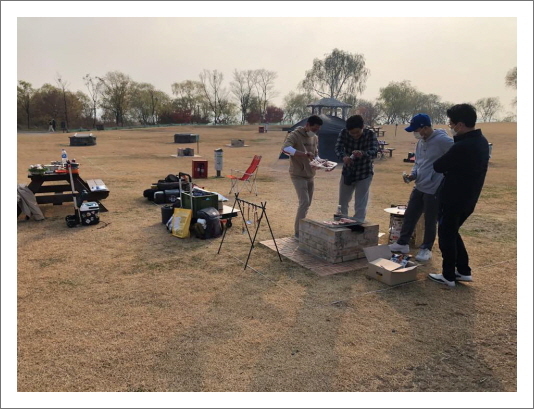 한쪽에선 곱창을 굽고 다른 쪽에선 목살과 삼겹살을 구워내는 우리들. 적당한 양으로 고기도 다 먹고 곱창도 맛있게 해결했다. 미세먼지 종일 나쁨으로 뭔가 안개가 낀 듯한 뿌연 날씨였지만, 나름대로 자연을 즐기고 추억도 되씹고 행복한 시간을 보냈다.