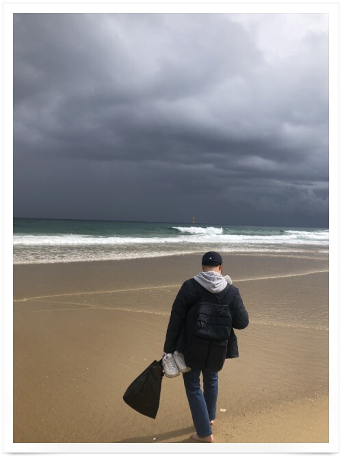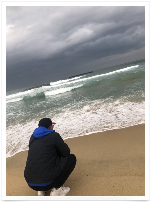 첫번째 사진은 아마도 첫날 숙소 도착해서 짐풀고 나와서 거닐었던 바다의 모습이고, 두번째 사진은 복귀하는 날 오후에 걸었던 바다. 신발도 벗고 모래와 바닷물을 느껴보고 싶었다. 왼쪽의 검정비닐은... 삼척 오징어(마른) 사서 터덜터덜 들고 가는 인절미의 뒷모습